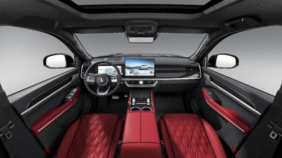 内饰采用上黑下红双色设计,配备Nappa真皮菱格绗缝座椅,前排与后排四座均标配通风、加热及按摩功能。二排座椅配备45度侧翼翻转航空头枕、多档可调靠背,支持接近纯平放倒,后备厢最大容积达1489升。车内还集成5.4升温控车载冷暖冰箱,并搭载14.6英寸悬浮式中控屏。